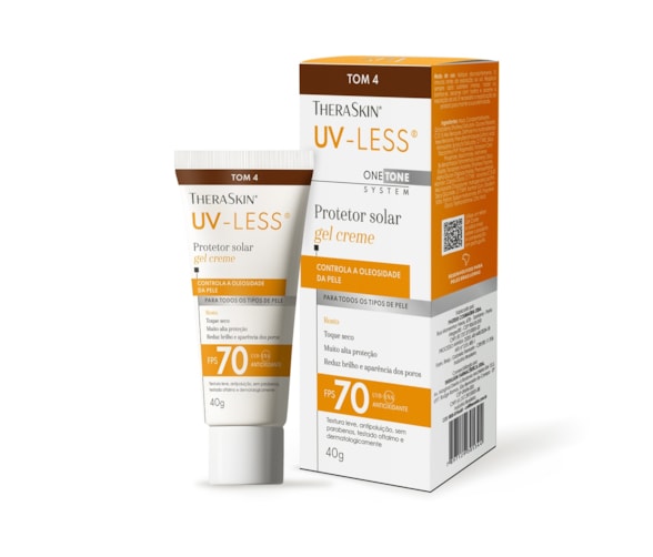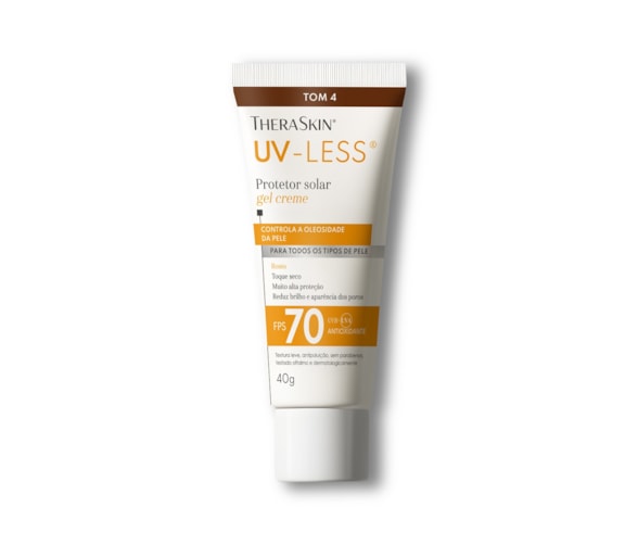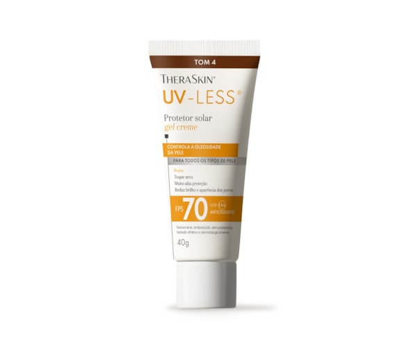O UV-Less® TheraSkin® é um protetor solar facial FPS 70 que protege contra radiação UVA, UVB e também contra a luz azul. Seu diferencial está no fator UVA 30, um dos mais altos do mercado brasileiro, fundamental para a prevenção de manchas, melasma e sinais de envelhecimento. Tom 4 que atende à diversidade da pele brasileira. Além da proteção solar, funcionam como um protetor solar facial com base, ajudando a uniformizar a pele.