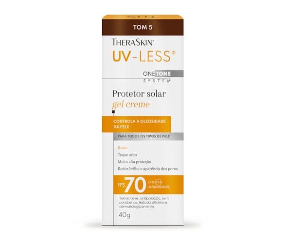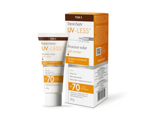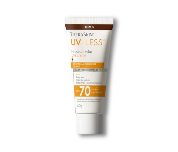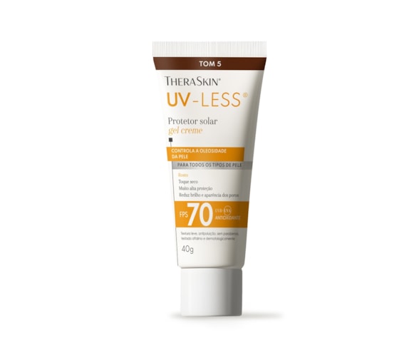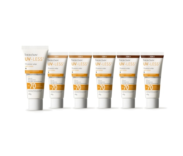 O UV-Less® TheraSkin® é um protetor solar facial FPS 70 que protege contra radiação UVA, UVB e também contra a luz azul. Seu diferencial está no fator UVA 30, um dos mais altos do mercado brasileiro, fundamental para a prevenção de manchas, melasma e sinais de envelhecimento. Tom 5 que atende à diversidade da pele brasileira. Além da proteção solar, funcionam como um protetor solar facial com base, ajudando a uniformizar a pele.